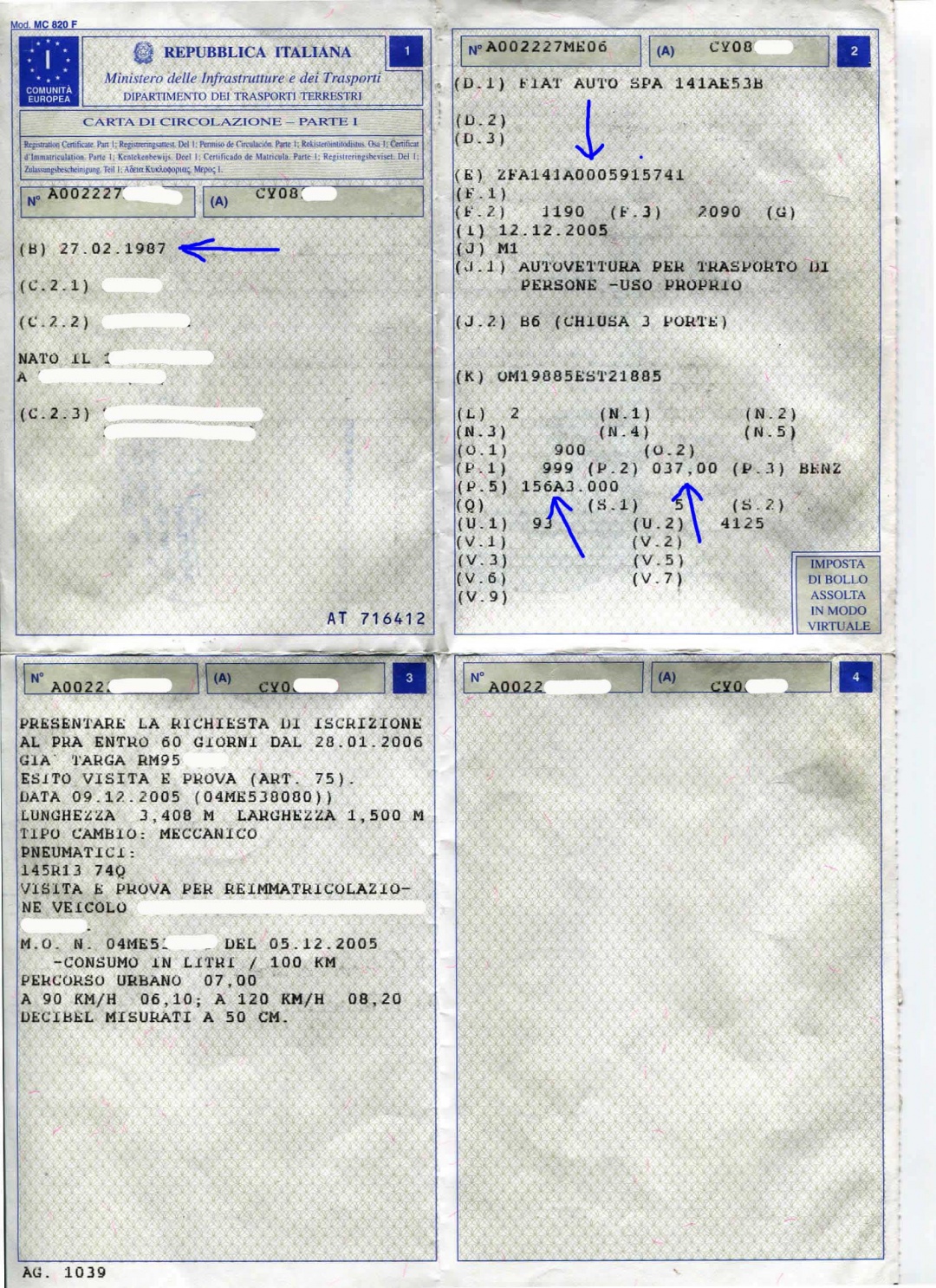 4) N° identificativo del veicolo : ZFA141A000--BLOCKED-- DEL 27.02.87