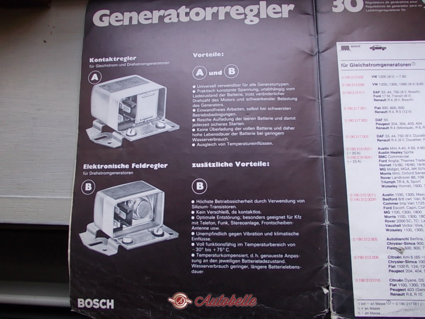 Per Alfa Romeo Giulia,Gt 1300,1600,1750,GTV 2000,Duetto,Montreal-Porsche 911 e 914-BMW 1602,2002 e altri modelli,vendo regolatore separato per alternatori "Bosch".Sostituisce il tipo montato di primo impianto avendo questi vantaggi: Massima operatività dei transistori al silicio-Nessun blocco perchè è senza contatto-Soppressione ottimale delle interferenze,particolarmente adatto per veicoli con telefono,impianti stereo,antenna al parabrezza ecc.-Perfettamente funzionante a temperature da -30° a +75°-Compensazione della temperatura,ovvero adattamento preciso al rispettivi livello di carica della batteria,con maggior durata della stessa. Ricambio nuovo,originale "Bosch".