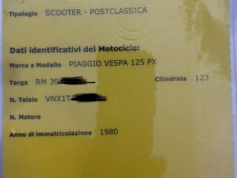Motorcycle: Piaggio Vespa 125 TS Frame: VNL3T-3911 Engine: VNL3M 2 stroke Cylinders 1 Power: 123.4 CV8 Change n ° 4 gears Approval: OM 14301 of…ID: 298762 | 21/03/2020 | Genova