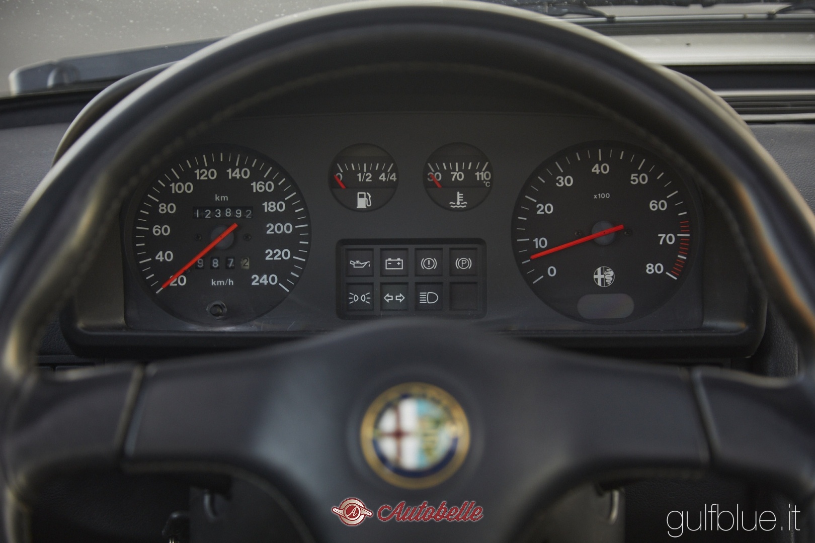 Questo esemplare è stato immatricolato a Mantova dal primo proprietario nel Gennaio del 1994, nel colore Biancospino con equipaggiamento molto completo che comprendeva aria condizionata, tetto apribile, antifurto con telecomando, servosterzo e ABS. Gli interni in alcantara grigi e neri unitamente al volante sportivo e pomello del cambio in pelle erano invece appannaggio delle Quadrifoglio che avevano anche i cerchi in lega da 14” di serie. Standard era anche la chiusura centralizzata, i vetri elettrici anteriori, i doppi specchi retrovisori con calotta verniciata del colore della carrozzeria e l’orologio digitale.