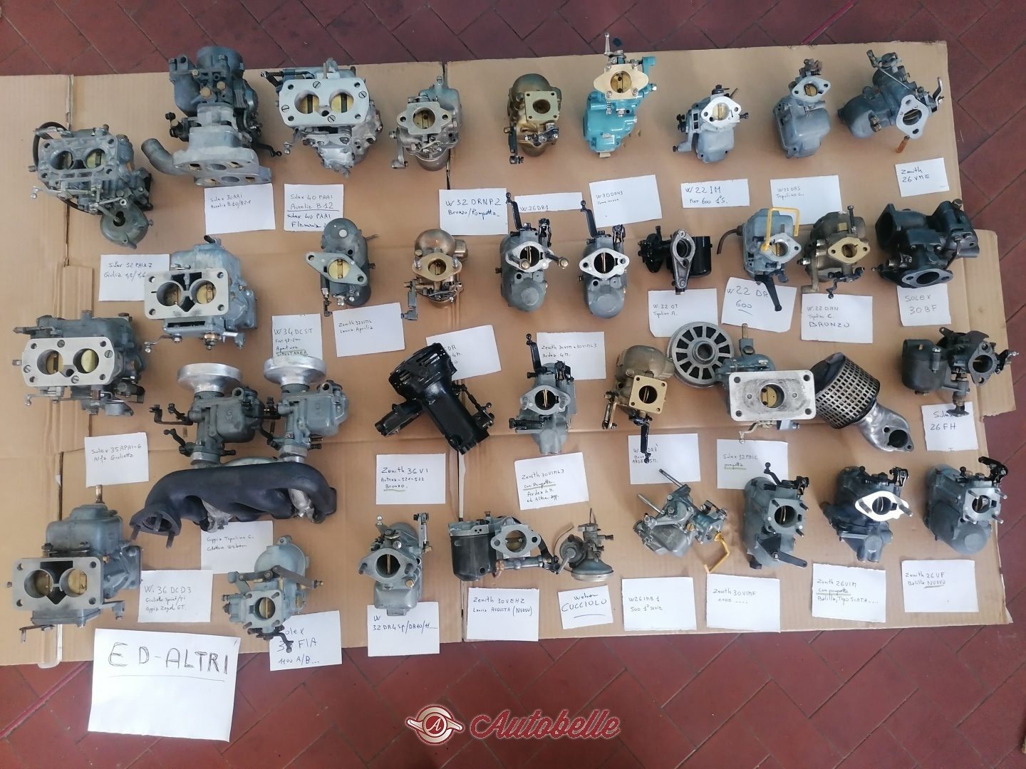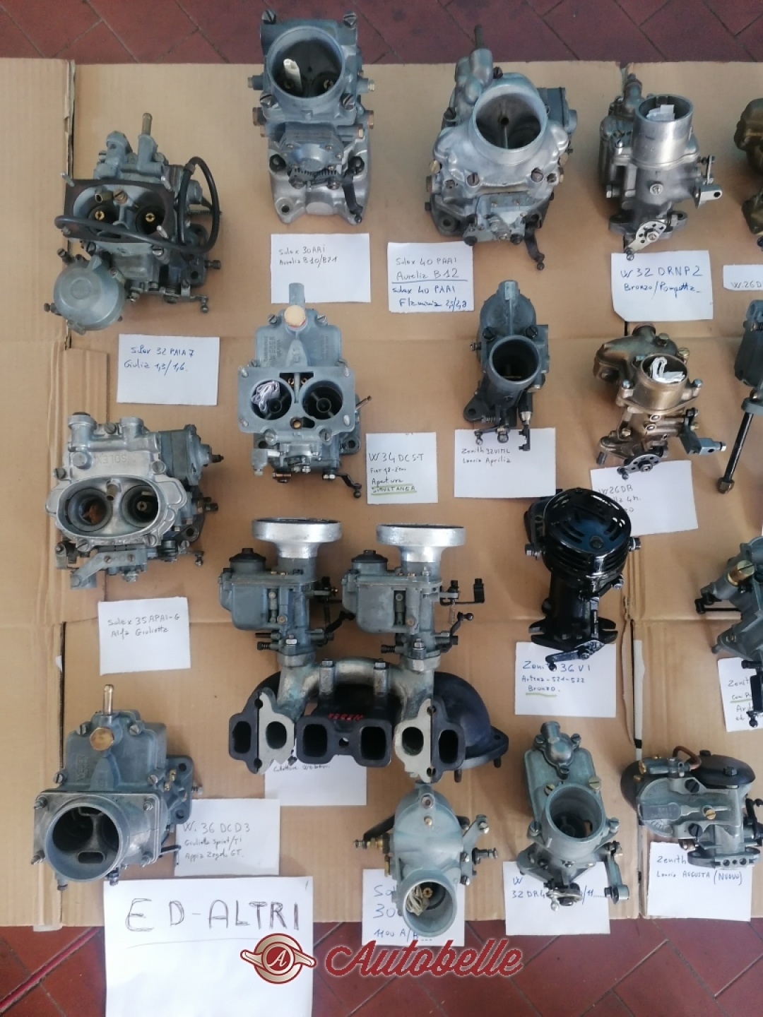 Carburatori Weber di Bronzo e Zenith revisionati : Ardea 5M. app. speciale 26DR3 --Balilla 4M. 26DR1 -- Abarth 750 32DRN2 con pompette di ripresa -- Weber 30 DR3 per diverse applicazioni -- Fiat 500 C 22 DRN -- Weber 26 DR flangia ovale -- Lancia Aprilia Zenith 32 VIML -- Lancia Ardea 4M. zenith 30 VIML -- Lancia Augusta Zenith 30 VEHZ -- Balilla orizzontale Solex 26 AHD --e molti altri.