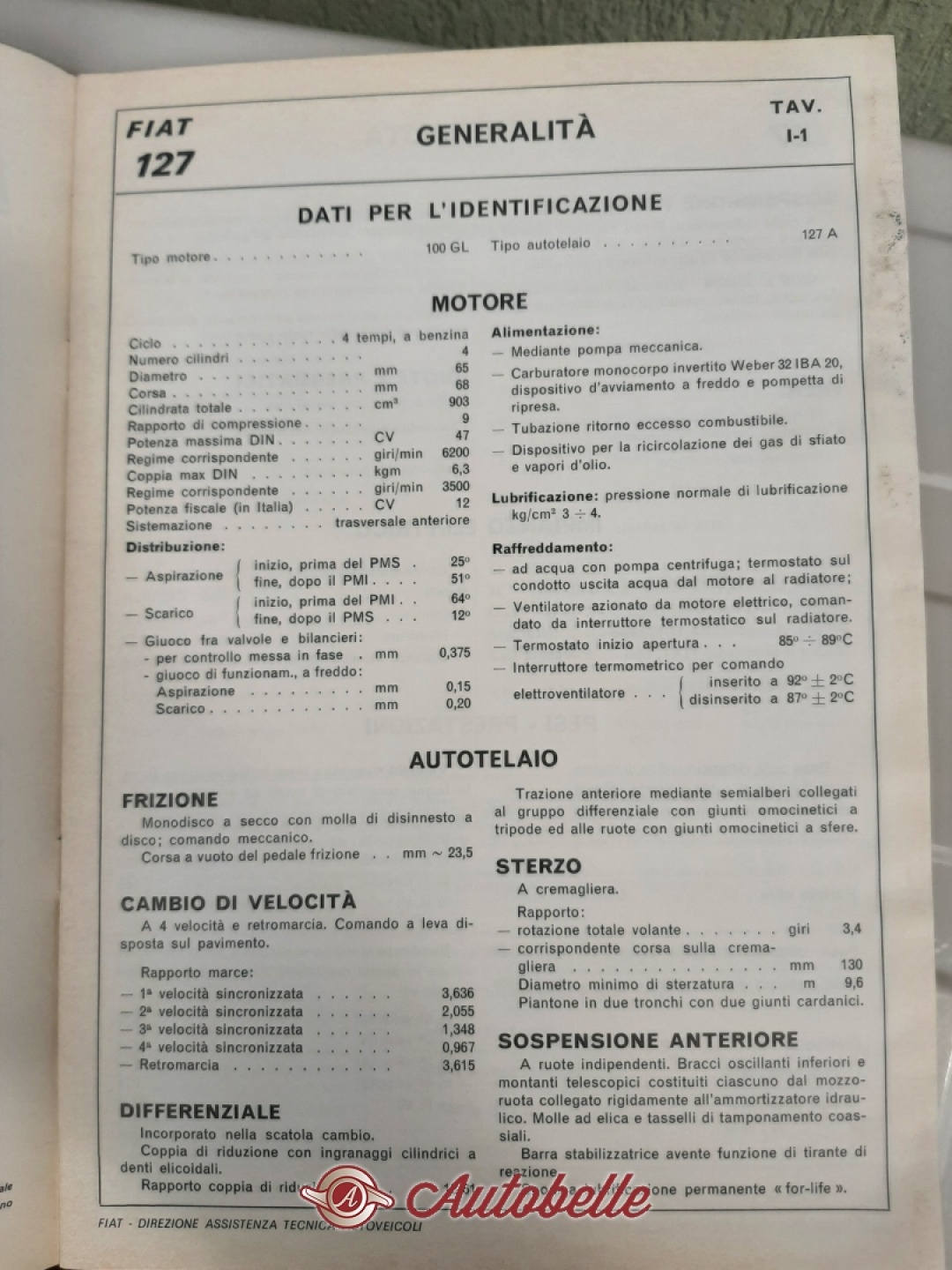 FIAT 127 DATI PRINCIPALI PER LE RIPARAZIONI ANNO 1971 ORIGINALE