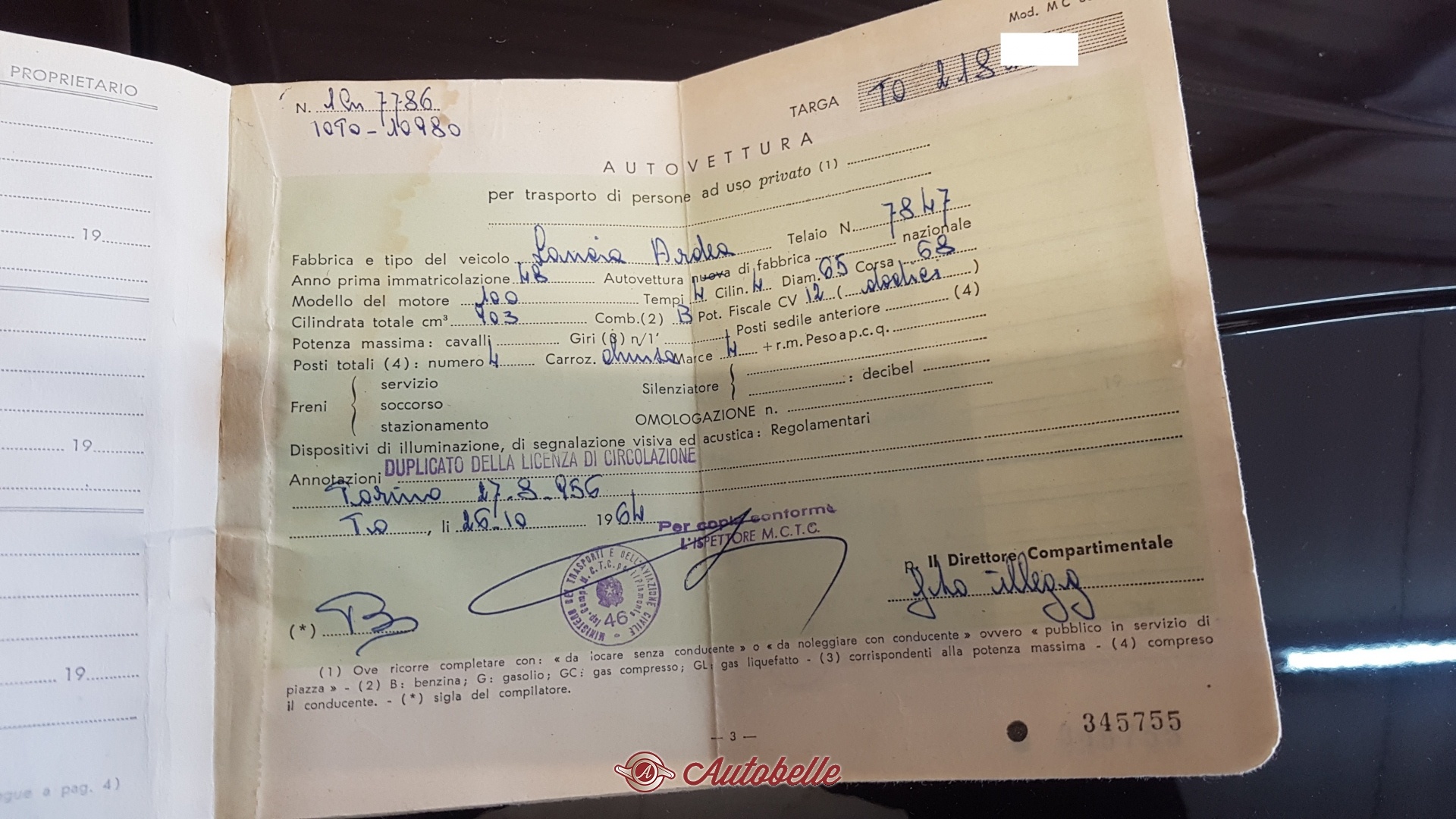 Libretto di circolazione a pagine, targhe nere. Telaio 7847.